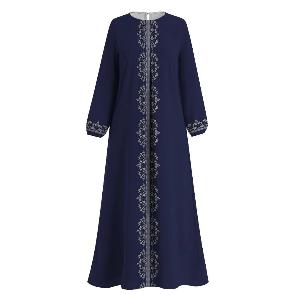 Modest blue abaya women ethnic print long sleeves islam muslim abaya o-neck muslim dress femme dubai turkey caftan arabia robe