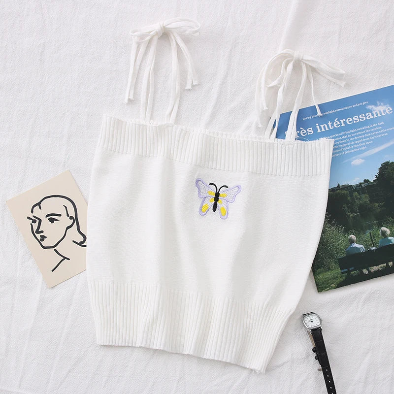 Oumea knitting bow tie cami tops butterfly embroidery spaghetti knit sexy crop top summer women tops casual going out skinny top