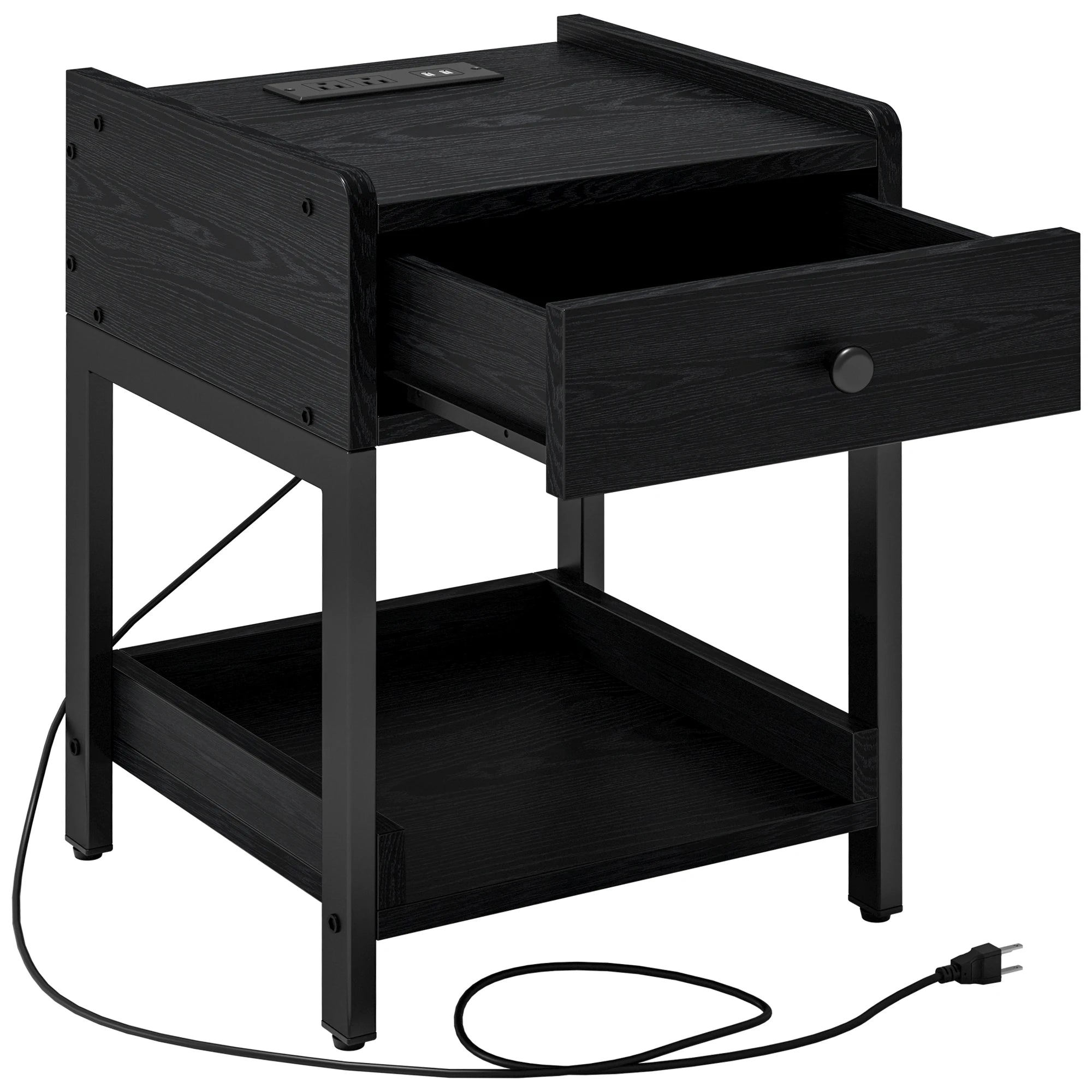 Likimio meja malam kayu hitam, meja sisi katil dengan stesen pengecasan, meja hujung kecil dengan laci penyimpanan dan rak untuk bilik tidur dan