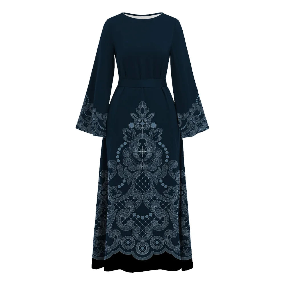 Muslim islam sederhana o-leher hitam abaya demure berkobar lengan muslim abaya lace corak cetak dubai maghribi tunik gaun dengan tali pinggang