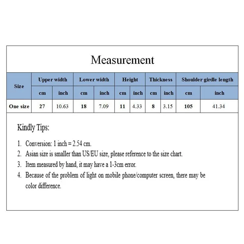 Saiz: Lebar atas kira-kira 27cm, lebar bawah kira-kira 18cm, ketinggian kira-kira 11cm, ketebalan kira-kira 8cm, dan panjang tali bahu adalah kira-kira 105cm