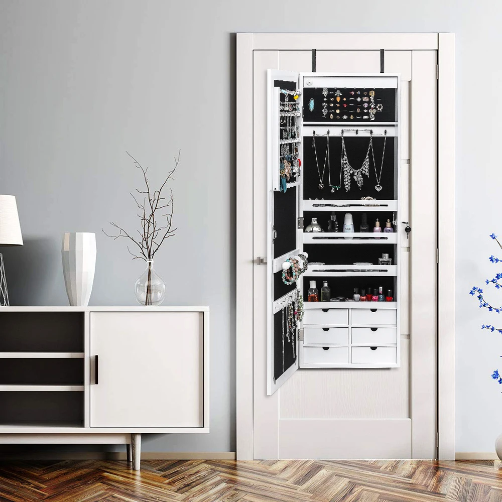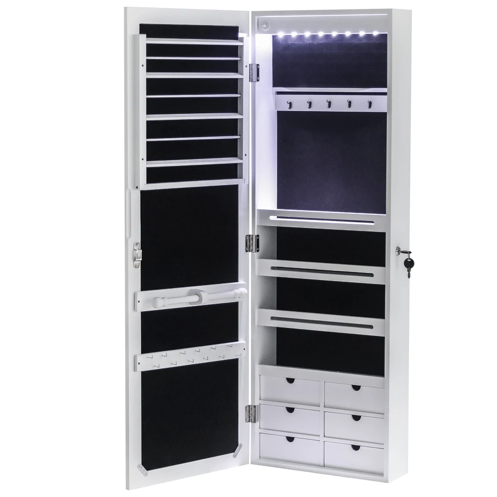 2. Lampu LED automatik: 8 lampu LED Biru (boleh tanggal) boleh mencari barang kemas yang diingini dengan mudah dalam kabinet barang kemas. (LED dikuasakan oleh 3 bateri AAA, tidak disertakan). Selain itu, 65 alur cincin (13 dalam setiap baris dan 5 secara keseluruhan) dan 6 cangkuk retro ditambah di sebelah kanan kabinet. Terdapat juga empat rak, setiap satunya 4.3 inci dan enam laci untuk membantu anda menyimpan semua jenis barang