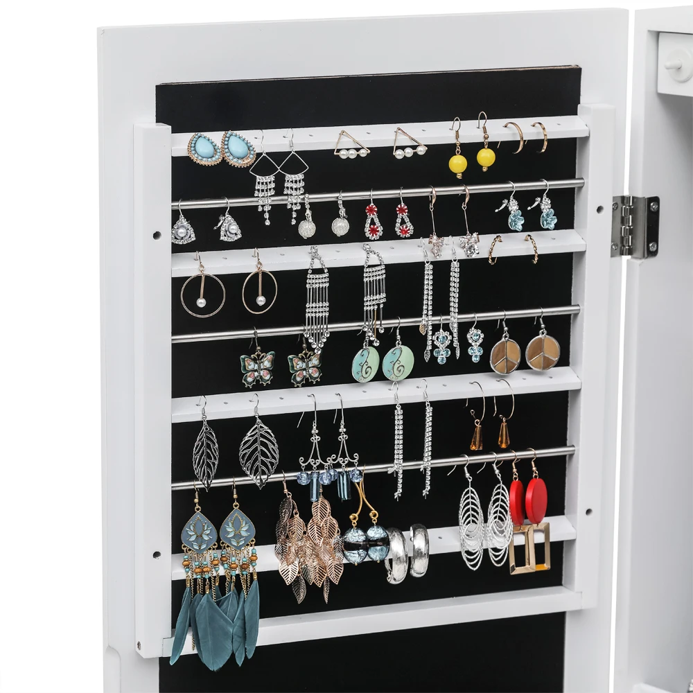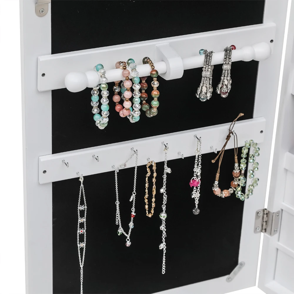 4. Pintu di sebelah kiri kabinet barang kemas mempunyai bingkai subang empat lapisan yang direka khas, yang mempunyai kecenderungan 60 ° dan tiga bar besi. Ia boleh memenuhi keperluan pelanggan yang mempunyai banyak subang. Di samping itu, satu bar gelang dan 12 cangkuk rantai membolehkan anda menyimpan barang kemas indah dan kecil anda dengan teratur
