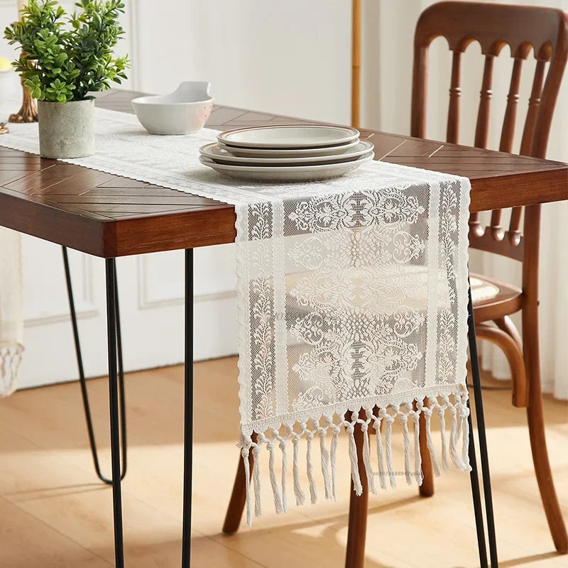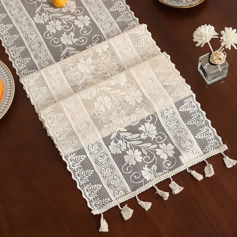 Pelari Meja Renda Putih INS Bendera Meja Penutup Debu Meja Makan Perkahwinan Penutup Pelari Meja Bunga Bersulam dengan Jumbai