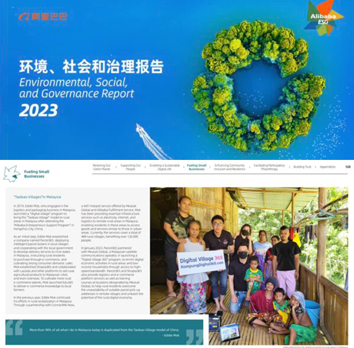 Digital Village 365 project by Shopla365 , Parcel365 , Measat Global Berhad and CONNECTme was featured in Alibaba’s annual ESG report 2023 – the first time an initiative by a Malaysian entrepreneur has received this honor.