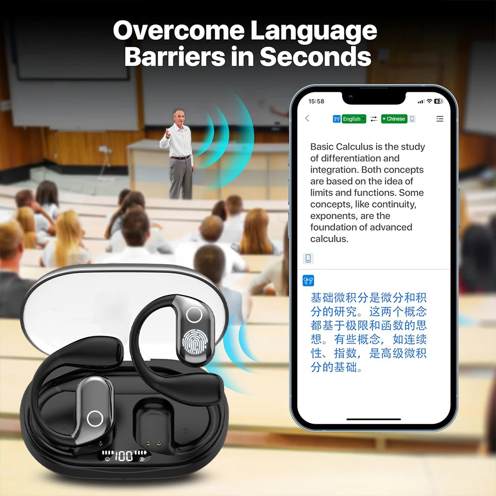 Bluetooth Earphones Translator Device 144 Languages Real Time Earphones Voice Two-Way OWS Translator HD Sound Open-Ear Earbud