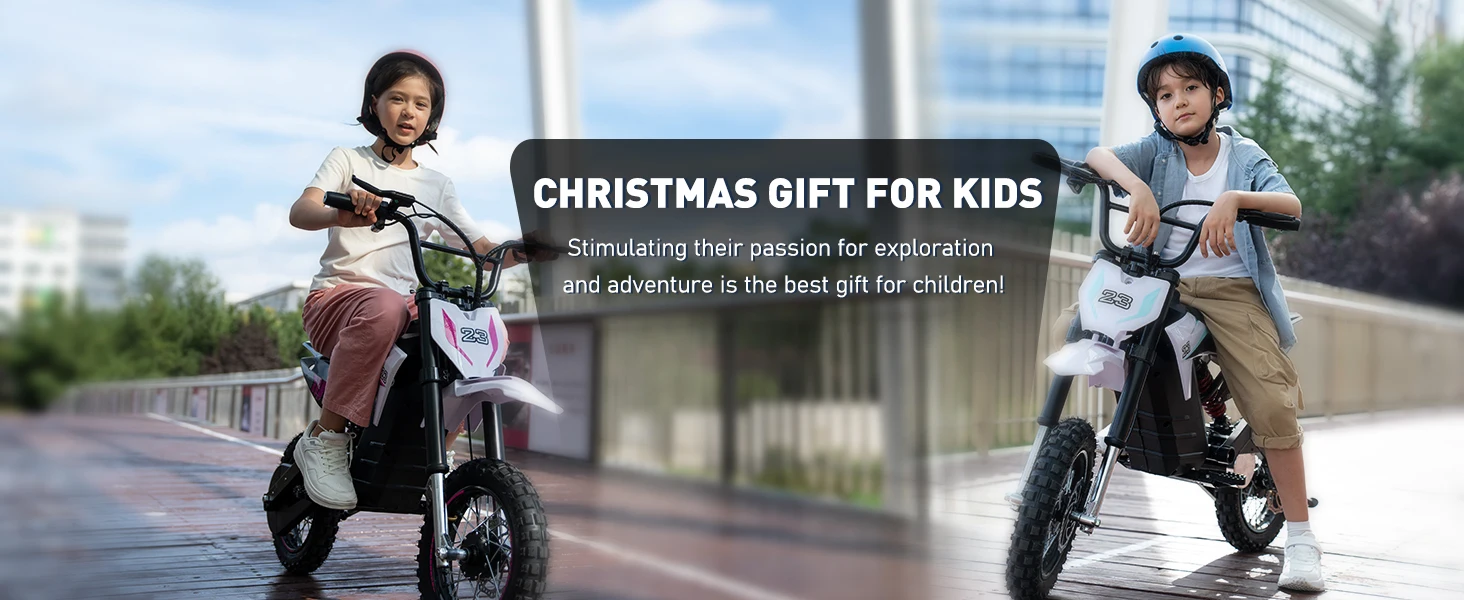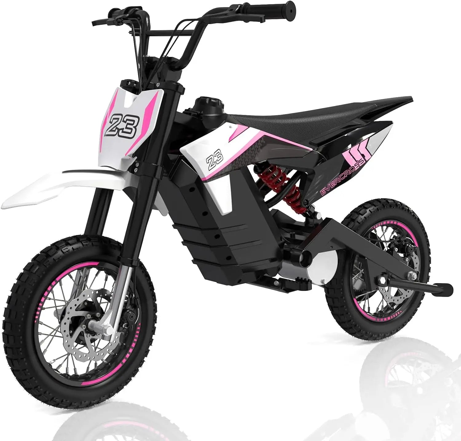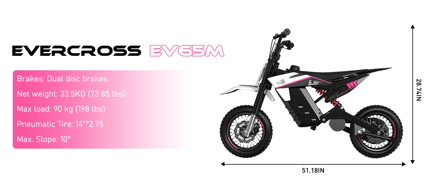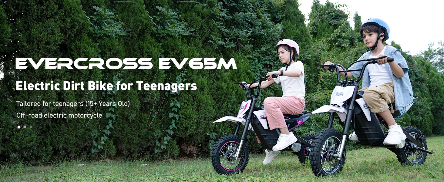 ★14" PNEUMATIC TIRES: EVERCROSS electric dirt bike for teenagers uses 14-inch large wear-resistant rubber wheels to provide stronger grip. The E-bike has rear disc brakes to provide safe power during passionate riding.