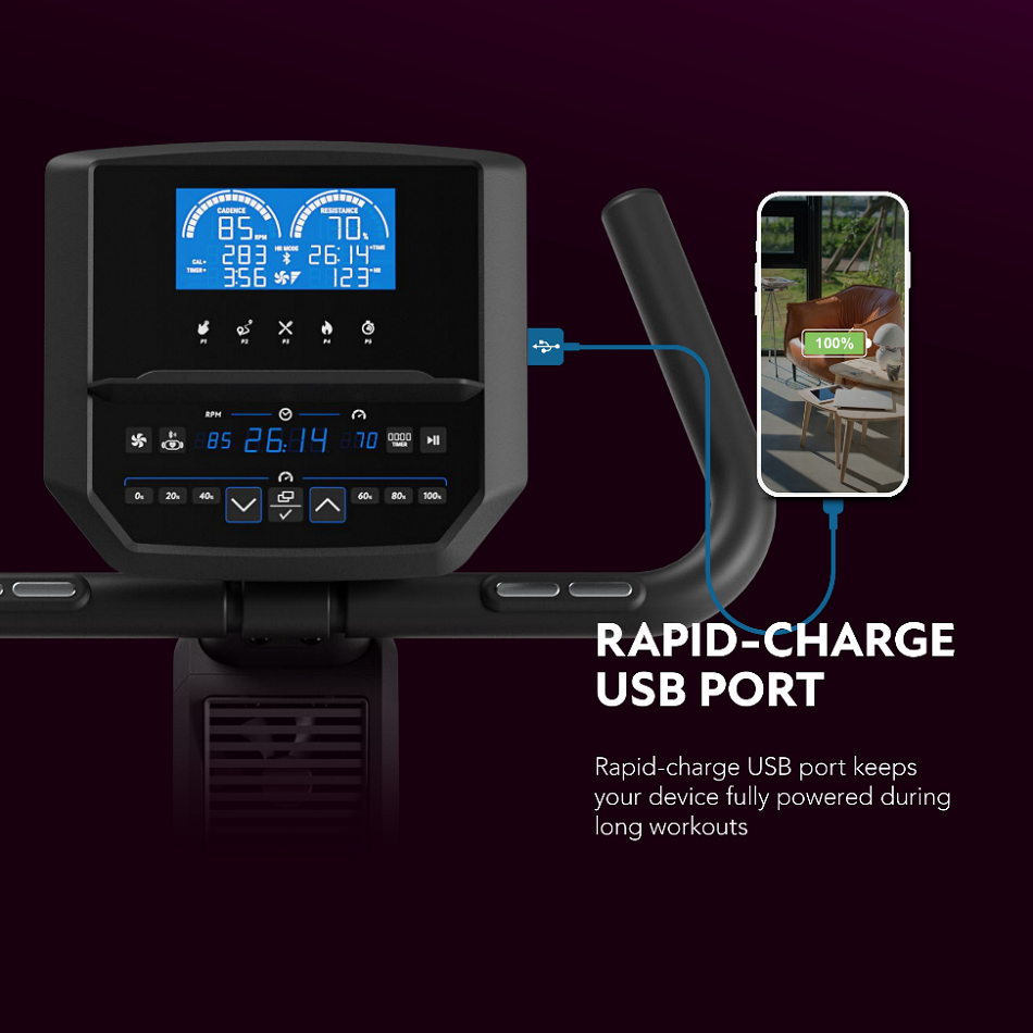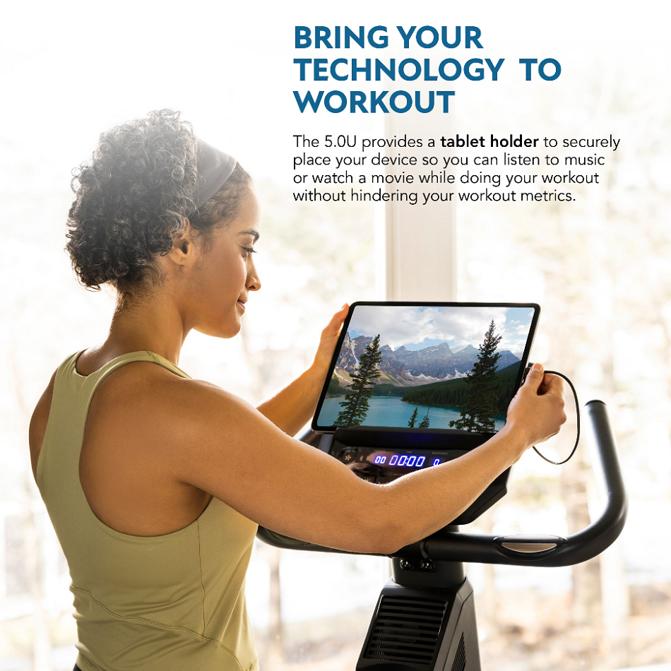 Connect To Your Content with Bluetooth~The 5.0U Studio cycle offers smart and simple connectivity. The eye level tablet holder lets you securely place your device, without blocking your workout metrics. Connect your cadence feedback to your favorite apps with Bluetooth, while keeping your device charged using the convenient USB charging port.