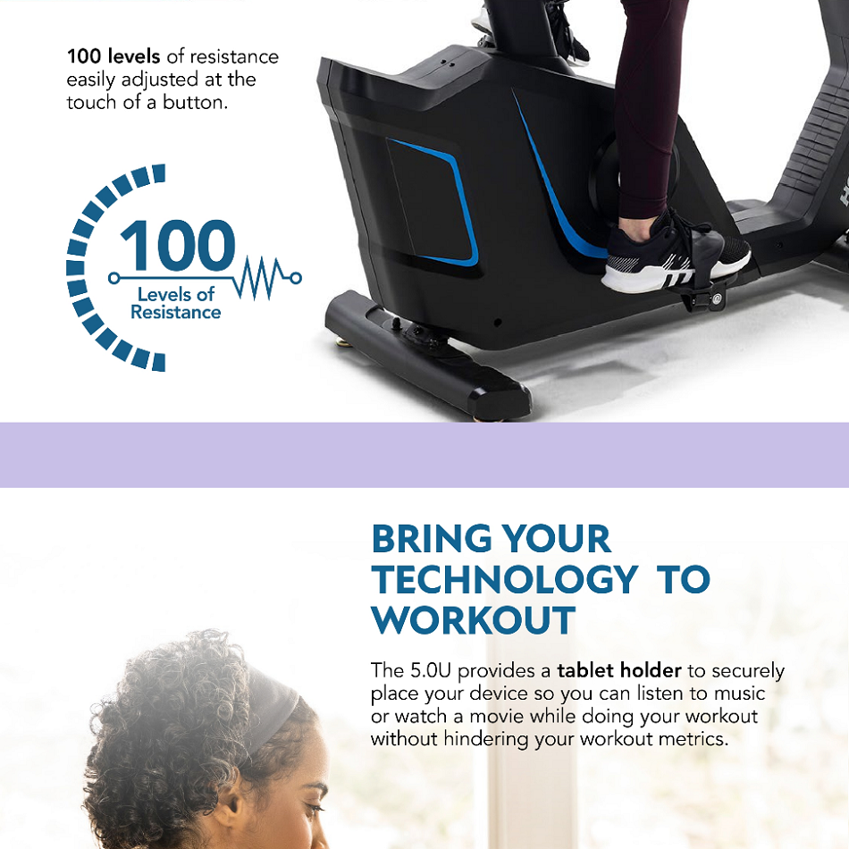 Easy Intuitive Control~Effortlessly keep pace with your favorite cycling classes. The 5.0U has 100 levels of resistance at the touch of a button, that allow for simple and precise changes as you ride.