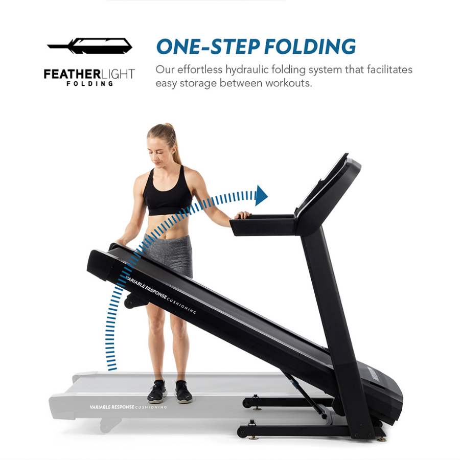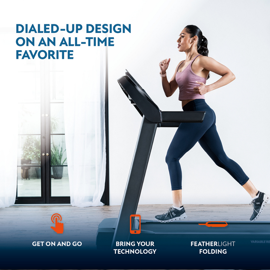 This best-selling treadmill is a favorite for a reason. With Bluetooth speakers, an integrated fan, easy assembly and a folding frame, the T101-27 is a great balance of features, quality and value. This new T101-27 version, control your speed and incline using QuickDial controls right on the hand grips. Perfect for following along with streaming workout classes, these in-reach dials make it easy to increase or decrease your workout intensity without breaking your stride.