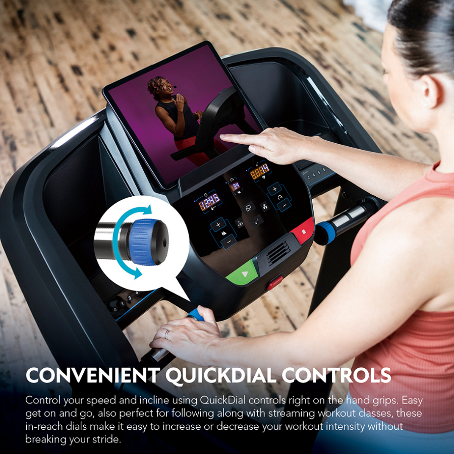 Intuitive dial controls, located right on the hand grips, simplify speed and incline changes without breaking your stride. On the right, roll the dial forward to increase speed and roll it back to decrease speed. On the left, roll it forward to go up the hill and roll it back to come back down.