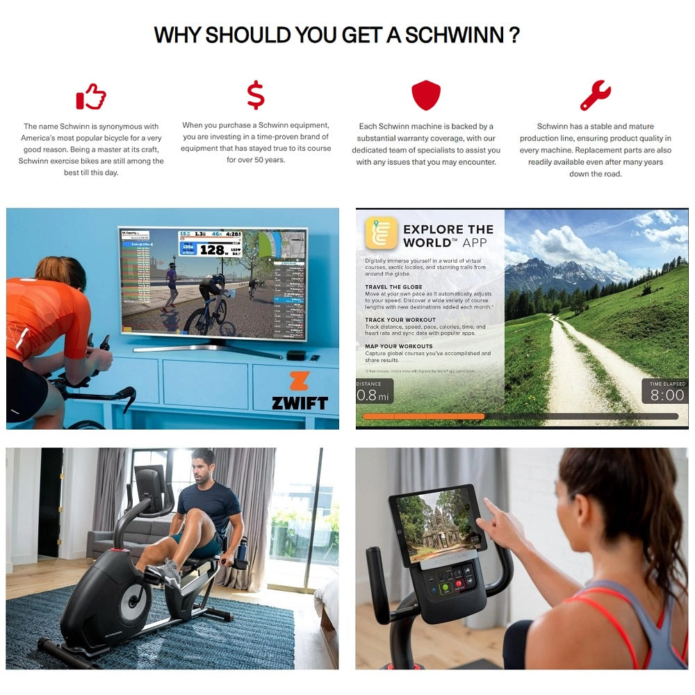 It’s our most affordable recumbent bike, and it delivers the ultimate indoor adventure by connecting you with world-class app experiences like Explore the World®, Zwift®, Kinomap® from your phone, tablet, or smart TV.