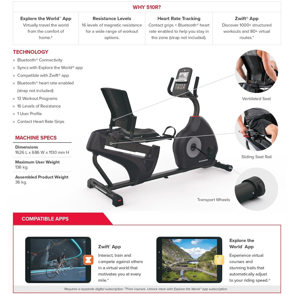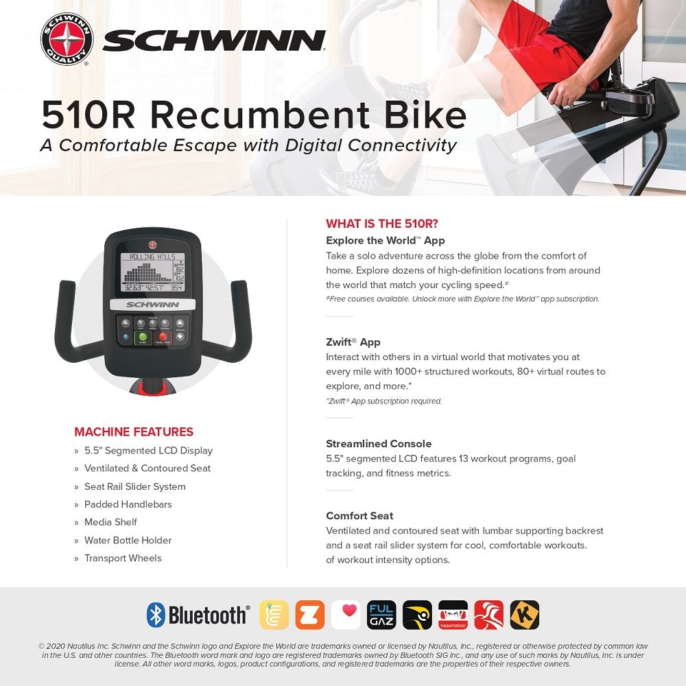 Designed with a solid build, comfortable ride, and user-friendly features, the 510R Recumbent Bike delivers the exceptional value you’ve come to expect from Schwinn.
