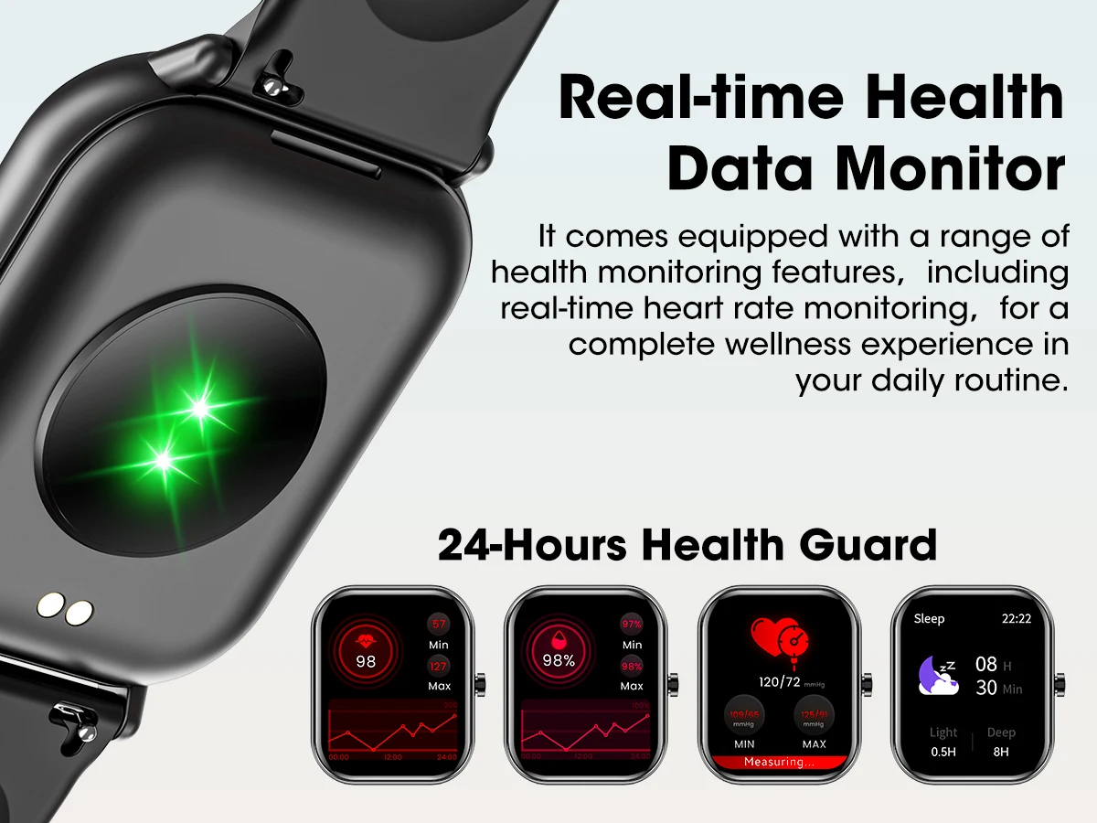 Real time heart rate, blood pressure, blood oxygen, sleep monitoring, call information reminder, stopwatch, timer, alarm clock, weather, photo shaking, music control, wrist turning and screen turning, sedentary water reminder, watch finding, multilingual call/text message content push