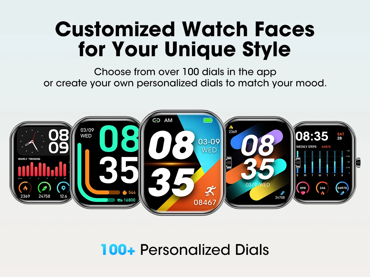 Bluetooth call, AI voice assistant, massive dial, weather forecast, 100 sports modes
