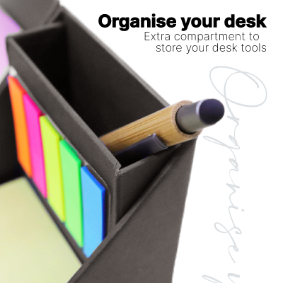 Boost your productivity with our memo notepad, an ideal item for your workplace or study desk. The design comes with stationary holder and assorted post-it sticky notes to keep your ideas and daily task organized.
