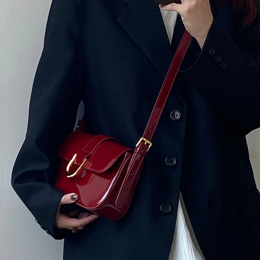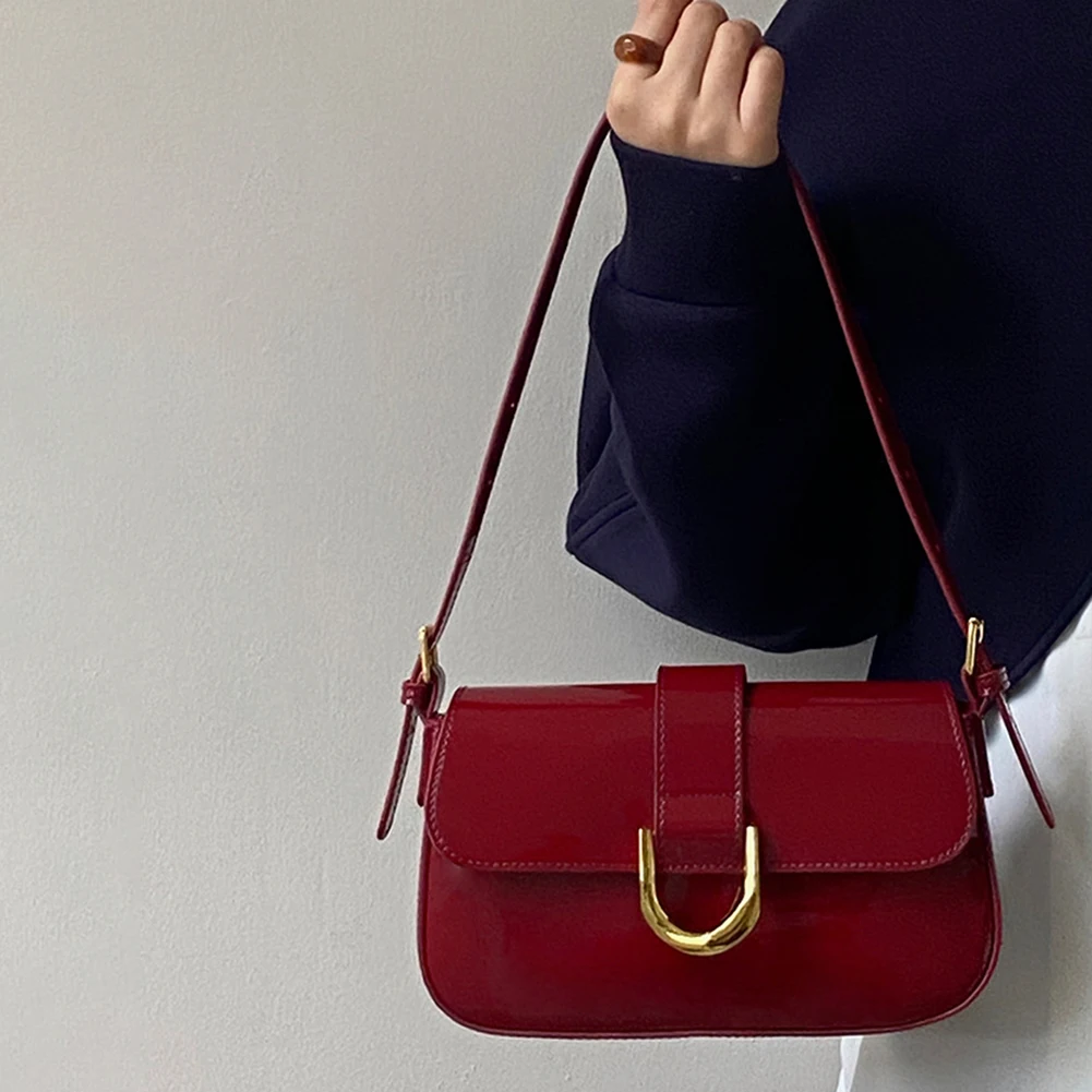 Retro Patent Leather Shoulder Bag For Women Solid Color Armpit Bag Flap Satchel Bag With Adjustable Strap Crossbody Sling Bag
