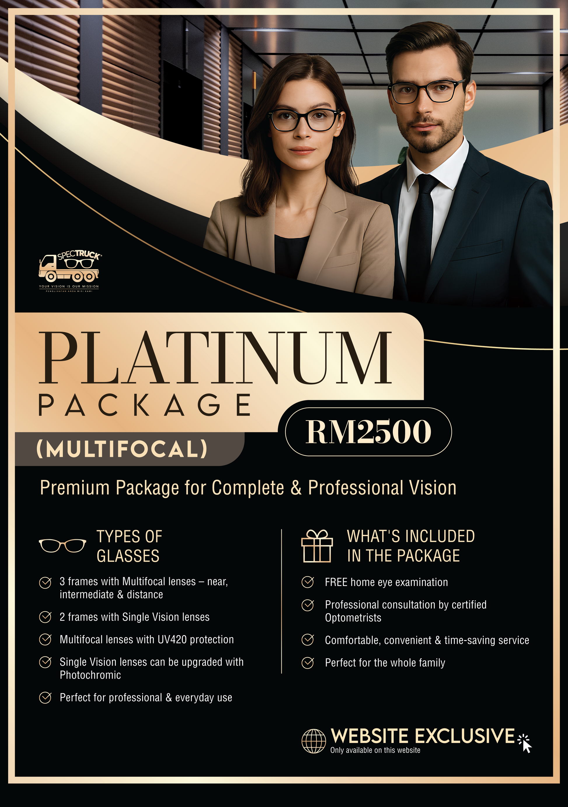 The Platinum Package offers a balanced mix of multifocal and single vision glasses for total convenience. With UV420 protection and optional photochromic upgrades, this package is perfect for customers who want premium comfort and professional style in one complete vision solution.